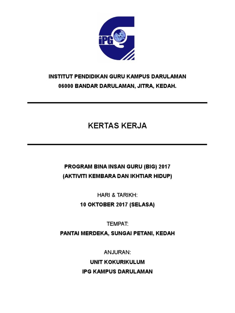 Contoh Kertas Kerja BIG. Program transformasi sekolah 2025 ts25 kohort 5 laporan program dan aktiviti. INSTITUT PENDIDIKAN GURU MALAYSIA KAMPUS KOTA BHARU CADANGAN KERTAS KERJA BINA INSAN GURU FASA V 2010 LAWATAN.
